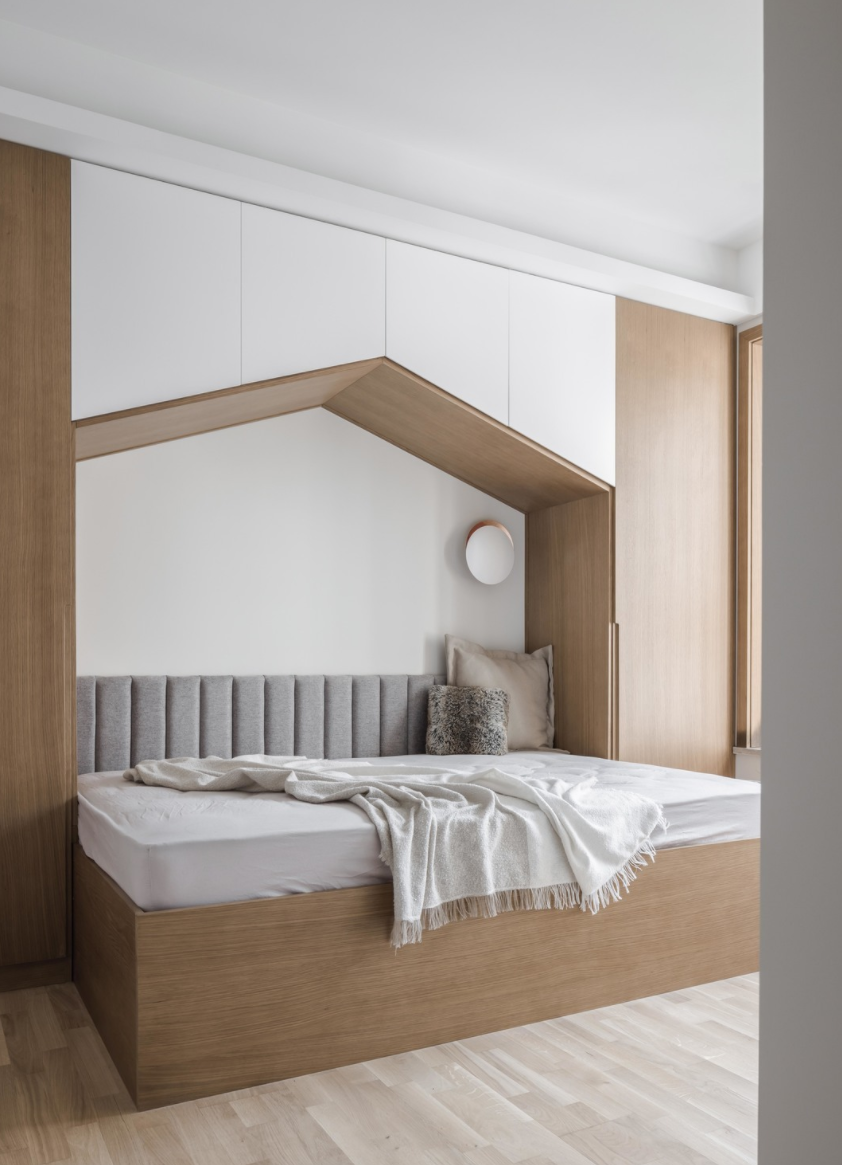 提前预留的儿童房,同样以一体化的定制家具为主,不过极具造型感的几何元素运用,却也为空间增添了一抹趣味。