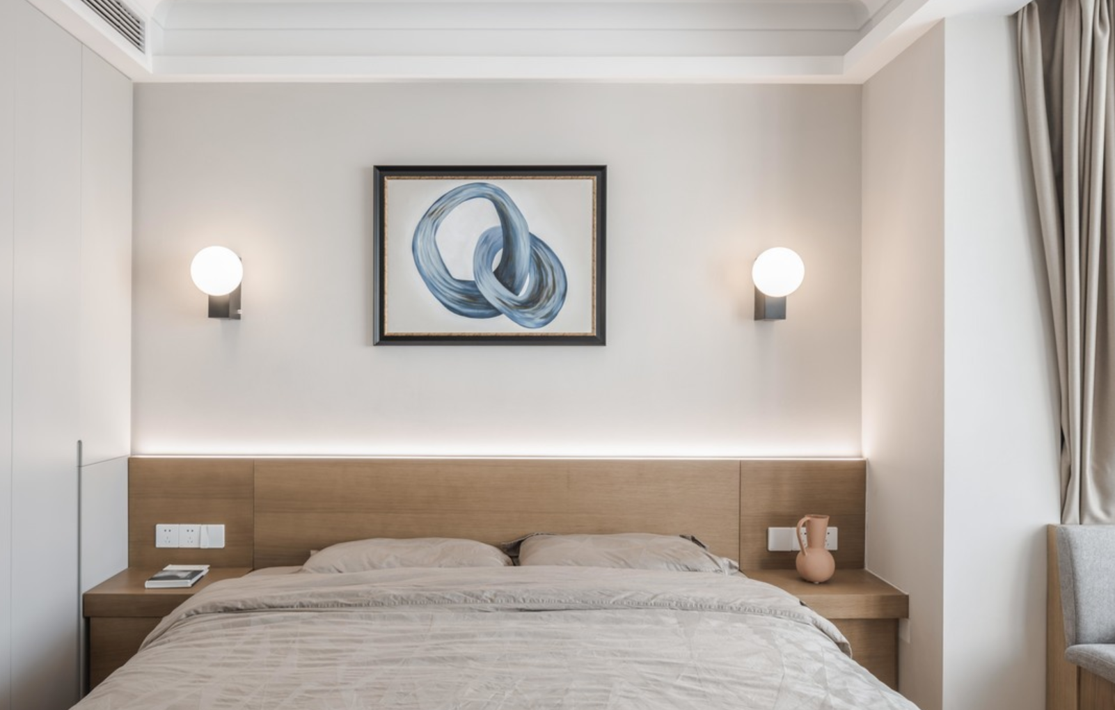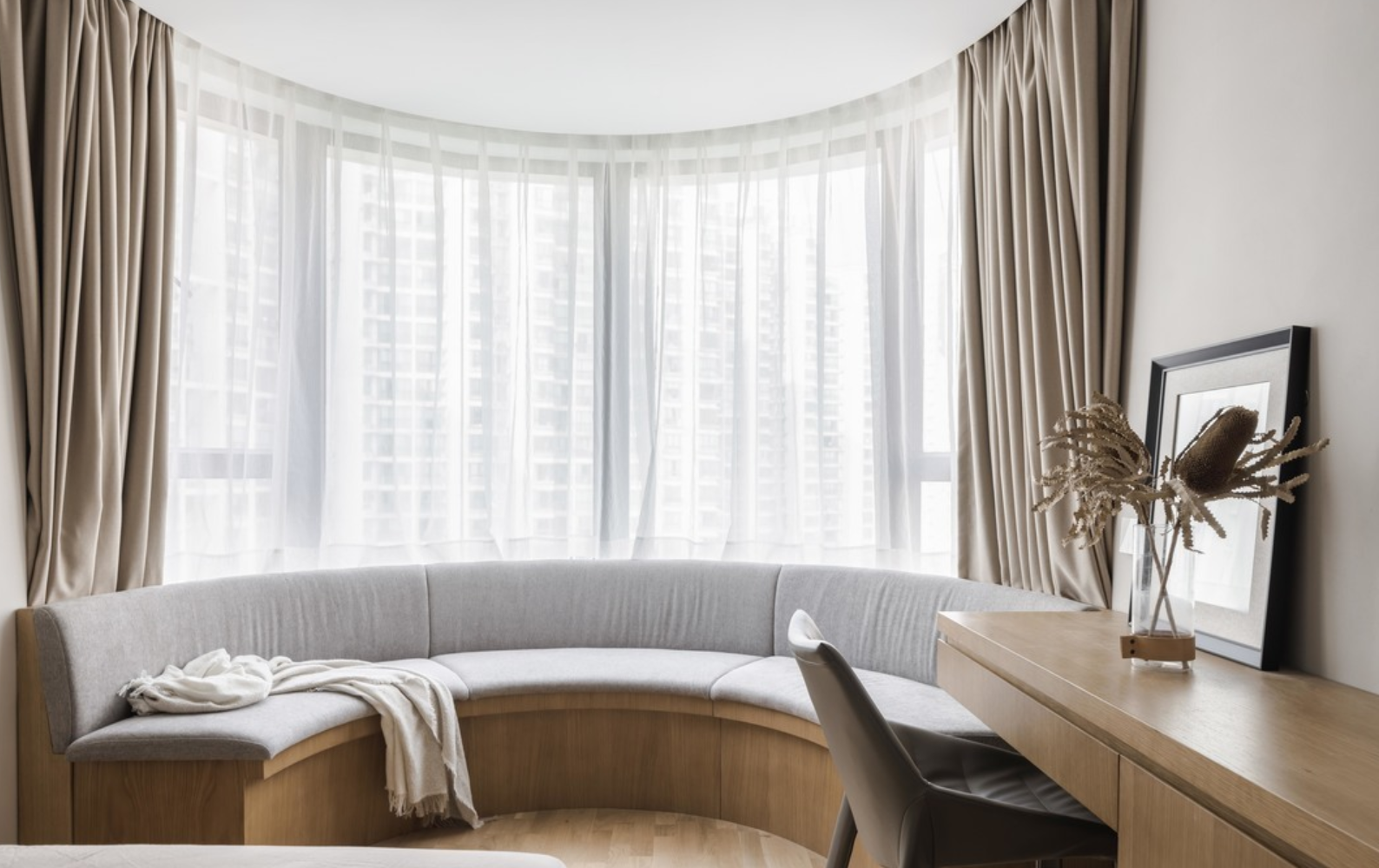 主卧室的设计依然秉持了简约的基调,不过一体化的床与床头柜设计,却也拉伸了空间层次。而在窗户为弧形结构的情况下,定制一组弧形的沙发,也成为了空间中的一个亮点,从而让窗外绿意,尽收眼底。