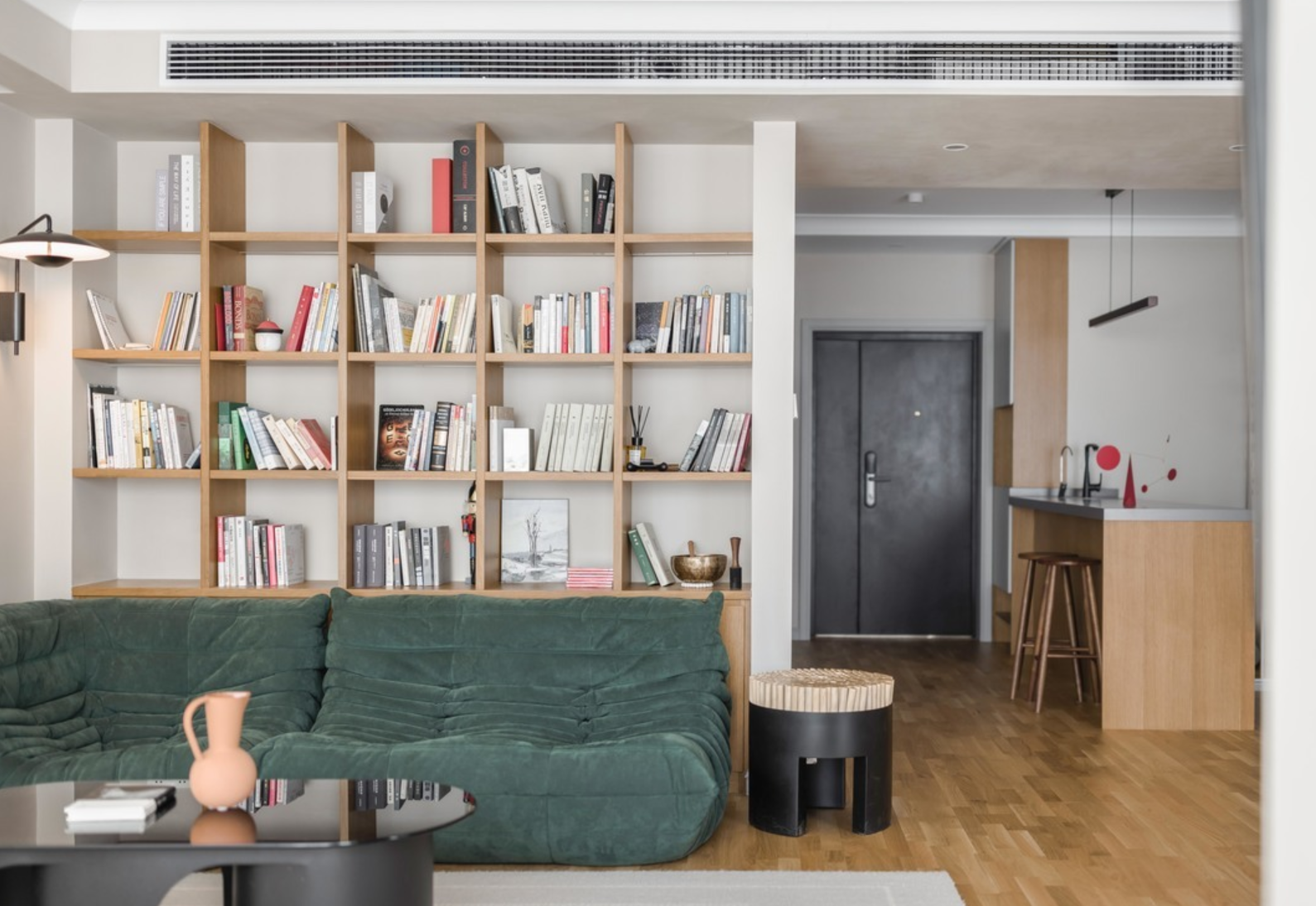 沙发墙设计书架,看似是一个比较简单的设计,但在摆满藏书后,却也为空间带来了一抹书香气息。当然,在书房缺少储物柜的情况下,也弥补了一定的收纳能力。