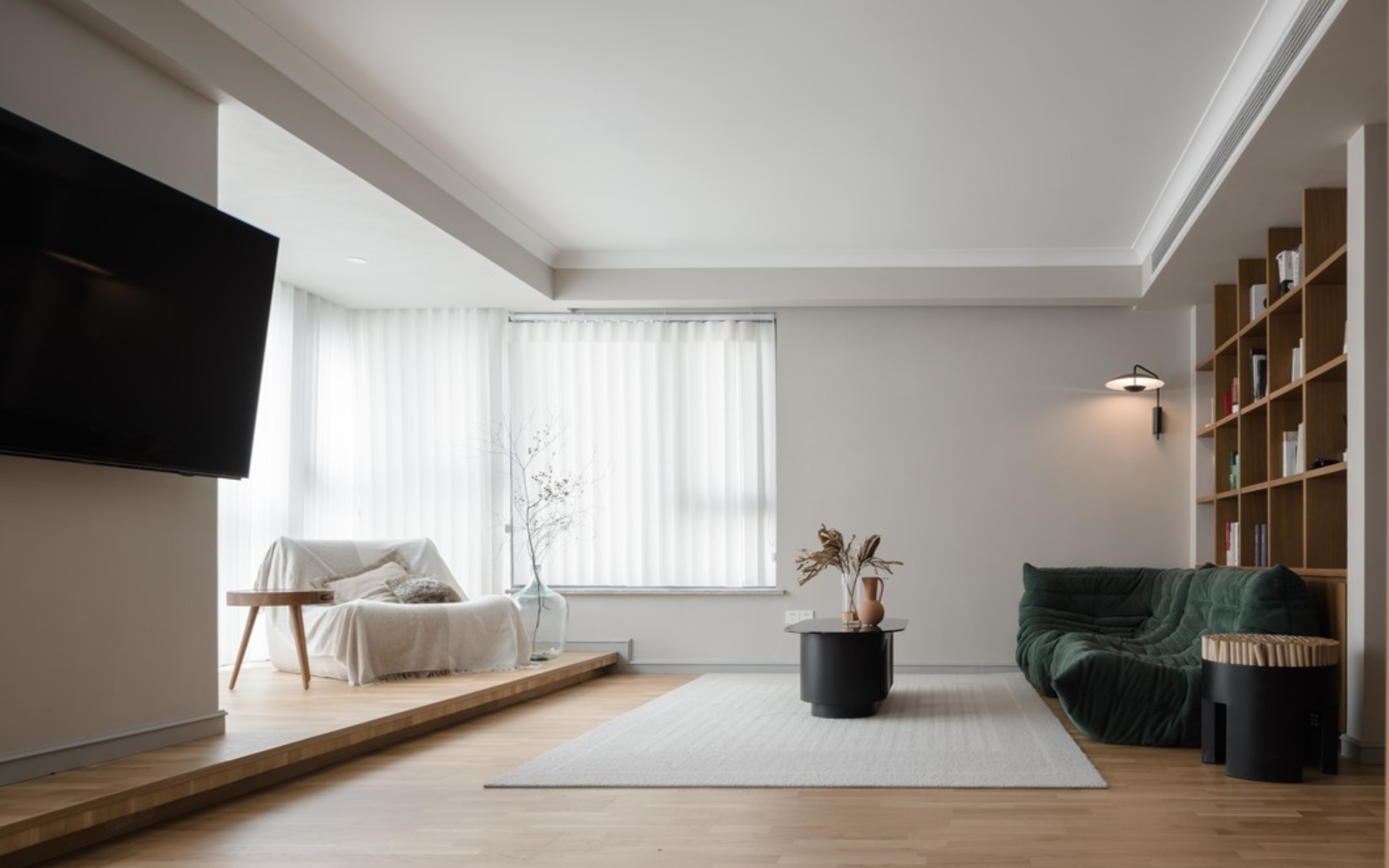 再比如悬挂在墙面上的电视机,就满足了不同角度的观看需求。同时,隐藏在正对面吊顶内的投影幕布,也可以让空间立马转换成家庭影院。