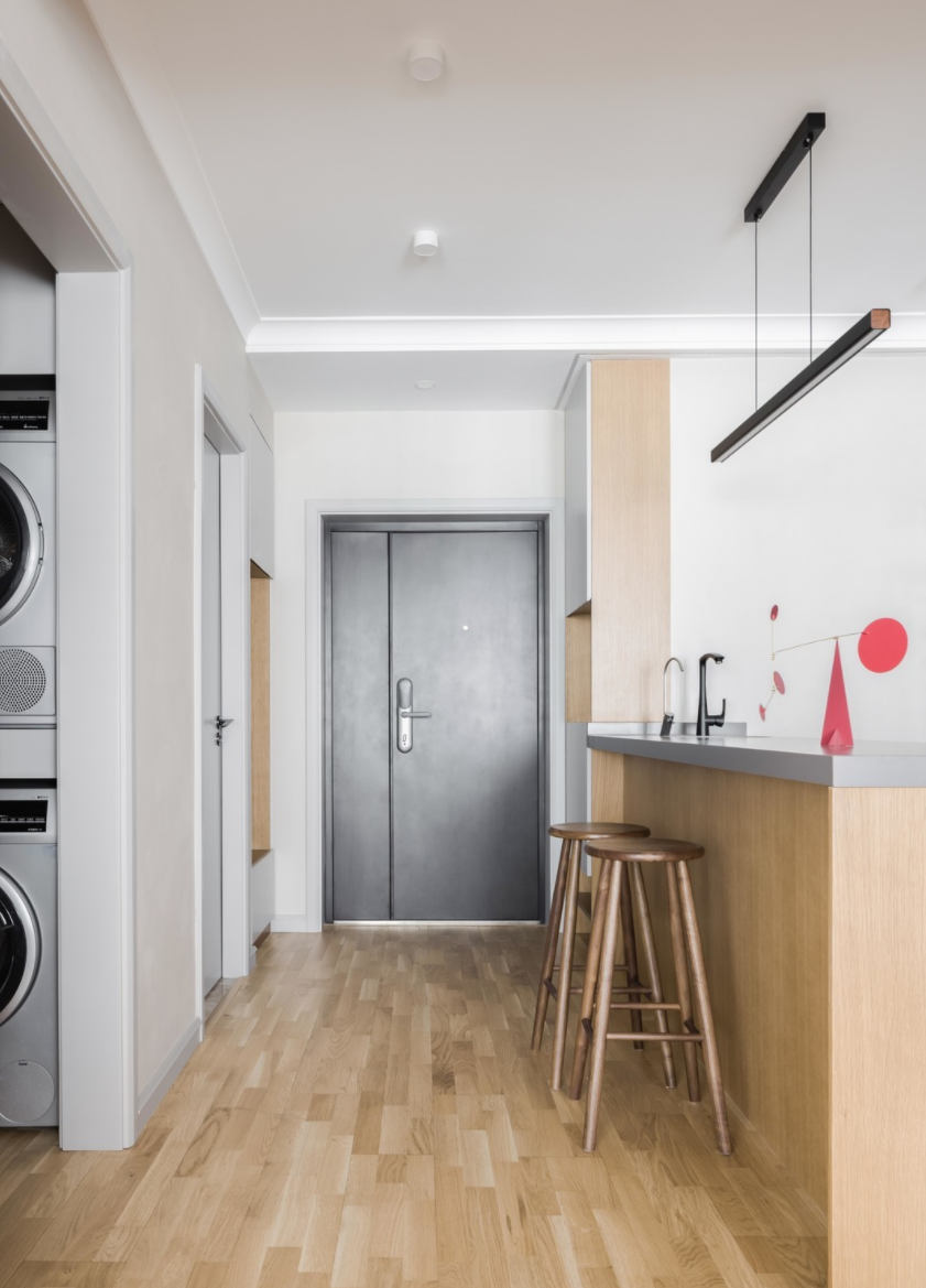 当餐厅改成水吧区之后,利用一组吧台隔断,不仅让入户形成了一块完整的玄关区,还丰富了空间的功能性。尤其是吧台上预留的水槽,更是在后疫情时代,极大程度保证了个人卫生。