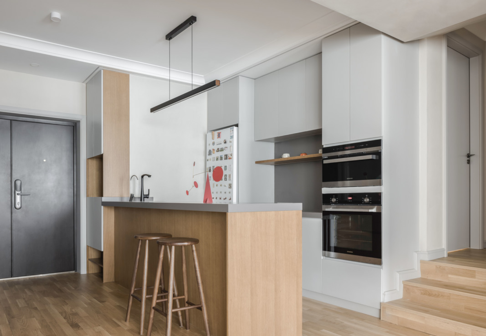 水吧区的设计,算是空间中的一大亮点。既在餐厅远离厨房的情况下,方便了夫妇俩的日常用餐需求,又兼具了西厨区的功能性。比如偶尔的西点、烘焙,就可以在这里操作,从而让生活更有情调。