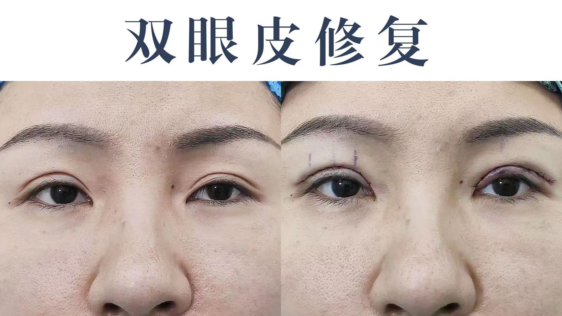 针对这样的情况修复方案采取全切修复,主要是修改双眼皮形态平行修改扇形,整体降窄双眼皮宽度,难点在于内侧瘢痕的处理,对于内侧过宽、瘢痕明显、皮肤量不足的需要保留部分瘢痕。