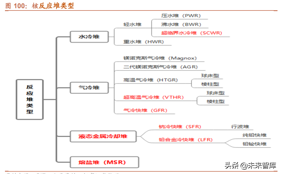 核电的应用和发展主要面临“选址条件苛刻”、“核废料处理困难”和“核泄漏风险难以规避”三大问题。针对这 三个问题,各国开始探索第四代核电技术。第四代核电技术让反应堆实现自我控制核泄漏,并选用氟化盐等物质替 代水,解决对水的依赖问题。在核废料的处理上,第四代核电技术有希望实现废料的循环利用,从而大大减少废料 的总量。根据冷却剂的不同,核反应堆可分为水冷堆、气冷堆、液态金属冷却堆和熔盐堆。目前在运大多数反应堆 属于压水堆。我国核电站发展已步入四代技术方案,四代方案在经济性、安全性、乏燃料后处理以及放置核扩散问 题等方面均将得到了一定程度的解决于完善。目前四代方案主要包括超临界水冷堆、超高温气冷堆、气冷快堆、钠 冷快堆、铅(铅铋)快堆以及熔盐堆,四代方案的发展将有效解决核电的安全性、经济性以及乏燃料后处理等一系 列问题。