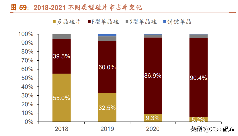单晶硅进一步替代多晶硅,市场占比接近 95%。2015 年以前,多晶硅片一直因其扩产快,对硅料技术要求低,生产 成本低等优势,一直占据市场主导地位;虽然单晶硅片的光电转换效率更高,但由于单晶硅片高昂的生产成本,一 直未能得到广泛应用。随着 2015 年切割和拉棒工艺的升级,单晶硅片的非硅成本(即长晶成本和切割成本)大幅下 降,从而获得生产成本优势,逐渐逆转了多晶硅片的主导地位。2021 年,中国单晶硅片市场占比约为 94.5%,而多 晶硅片的市场份额由 2020 年的 9.3%下降至 2021 年的 5.2%,根据 2021 年中国光伏产业发展路线图预测,未来多 晶硅片呈逐步下降趋势,但仍会在细分市场保持一定需求量。