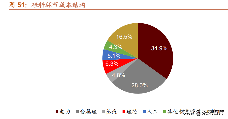 电价下降叠加多晶硅提取工艺进步驱动硅料环节降本。硅料环节的成本由金属硅、电力、人力等成本构成,其中, 电力成本和金属硅成本在各项成本中位居前二,分别占成本的 34.9%和 28%,是硅料环节的主要成本。基于此,电 力价格的下降和多晶硅提取工艺的进步是硅料环节降本的主要驱动因素。