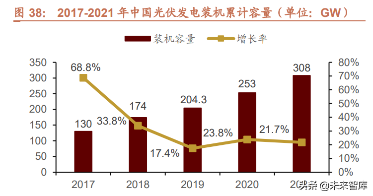 光伏发电装机容量符合预期,新增和累积装机容量均为全球第一。根据中国光伏行业协会数据,2021 年,全国新增 光伏并网装机容量达 54.88GW,同比增长 13.9%。累计光伏并网装机容量达到 308GW,同比增长 21.7%。全年光 伏发电量为 3259 亿 kWh,同比增长 25.1%,约占全国全年总发电量的 4%。2017 至 2021 年期间,我国光伏发电装 机累计容量由 130GW 增长至 308GW,CAGR 为 24.1%。