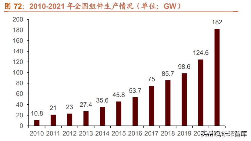 组件环节是光伏产业链的最末端,其主要任务是将上一环节中生产的电池片封装并销售给发电站客户。2021 年,全 国组件产量达到 182GW,同比增长 46.1%,以晶硅组件为主。