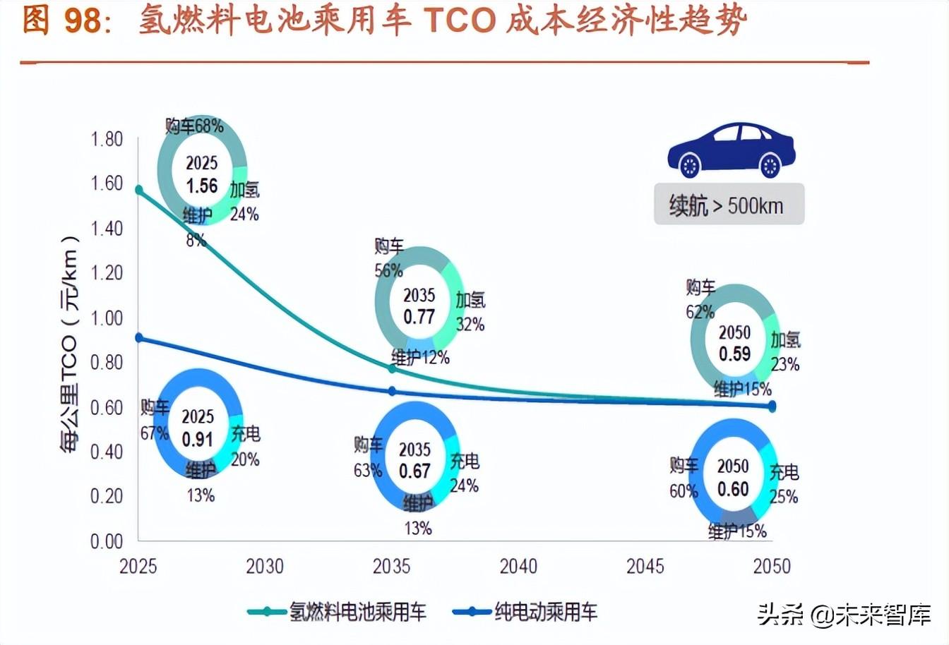 氢燃料电池汽车的全生命周期成本总拥有成本(TCO)与纯电动汽车等竞争产品的成本平衡点,是氢燃料电池汽车 在各细分领域市场渗透率提升的重要转折点。下面从面向消费者的全生命周期总拥有成本(TCO)角度分析,研究 氢燃料电池汽车未来的 TCO 发展趋势,研判各车型的产业化途径。