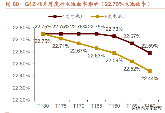 硅片薄片化降低硅耗,减轻成本压力。根据中环股份统计,以 A 类客户 22.75%电池效率为参考,使用 180μm 减薄 至 160μm 厚度的硅片,电性能没有下降,同时对应电池单瓦成本下降幅度明显;当厚度减薄至 155μm 至 150μm 区 间,电池电性能下降明显。根据中环股份发布的《技术创新和产品规格创新降低硅料成本倡议书》,硅片厚度从 175μm 减薄至 160μm,可以覆盖多晶硅料 8 元/KG 的价格涨幅,减轻下游产业链的成本压力;产业链内全规格单晶 硅片全面转换到 160μm 厚度,预计可节省 6.8%的硅使用量,以 G12 产品功率测算全行业可增加 20GW/年以上产 出。(报告来源:未来智库)