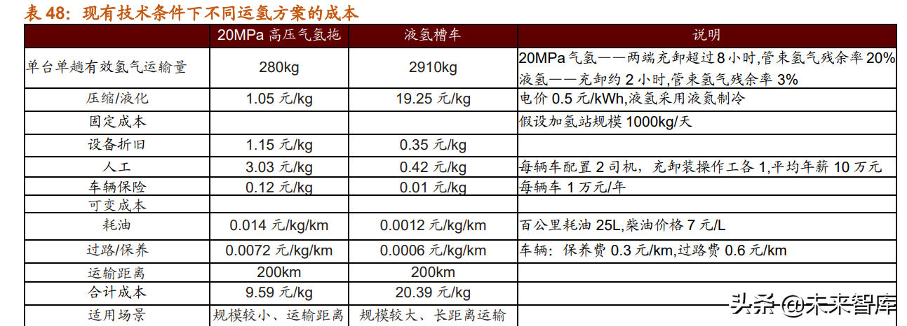 液态运氢满足大规模长距离运氢需求。氢的运输按形态主要可以分为三种:气态运输、液态运输和固体运输;按运 输方式可以分为三种:即陆运、海运和管网运输。目前,气态运输和液态运输是主流的运氢方式,高压气态氢运输 主要有长管拖车和管道运输两种方式。全球范围内,韩国主要采用了“高压气态+管道”的运输方式,日本正探索通 过液氢船将澳大利亚褐煤制氢气通过海运运回国。由于与远距离(1500 公里以上)输电相比,直接输氢更具经济性, 全球范围内输氢管道长度有限,不到 4500 公里。其中,美国和欧洲分别有 2500 公里和 1569 公里,我国目前仅有 100 公里。现阶段中国氢的运输方式以 20MPa 高压气氢拖车为主,在加氢站日需求量 500kg 以下以及短距离运输的 情况下,气氢拖车节省了液化成本与管道建设的前期投资成本。在用氢规模较大,长距离运输的情况下,采用液态 槽车和管道气氢的运输方式可以满足高效经济的要求,液态槽车运氢在大规模长距离运氢上相较于 20MPa 高压气氢 拖车储运有着显著的成本优势,随着氢能产业的发展,液态运氢是大规模长距离运氢的方向之一。目前我国在液氢 产业链各环节包括氢液化装置、储罐、罐车和加注系统等均已基本具备自主国产化的技术和产品。