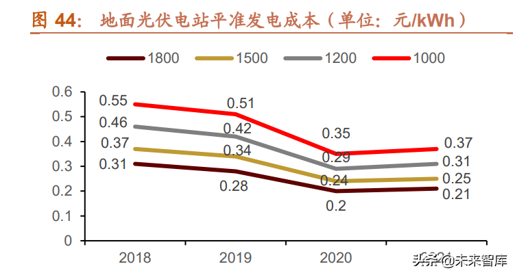 平准度电成本(LOCE)下降,分布式光伏电站平准度电成本低于光伏地面电站。2021 年,光伏地面电站在 1800 小时、1500 小时、1200 小时、1000 小时等效利用小时数的 LOCE 分别为 0.21、0.25、0.31、0.37 元/kWh,光伏 分布式电站在 1800 小时、1500 小时、1200 小时、1000 小时等效利用小时数的 LOCE 分别为 0.19、0.22、0.28、 0.33 元/kWh。