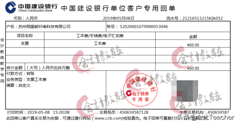 05月08日,出纳向基本户银行领取2本现金支票,工本费50元,款项直接从银行账户扣除。
