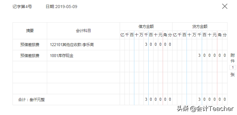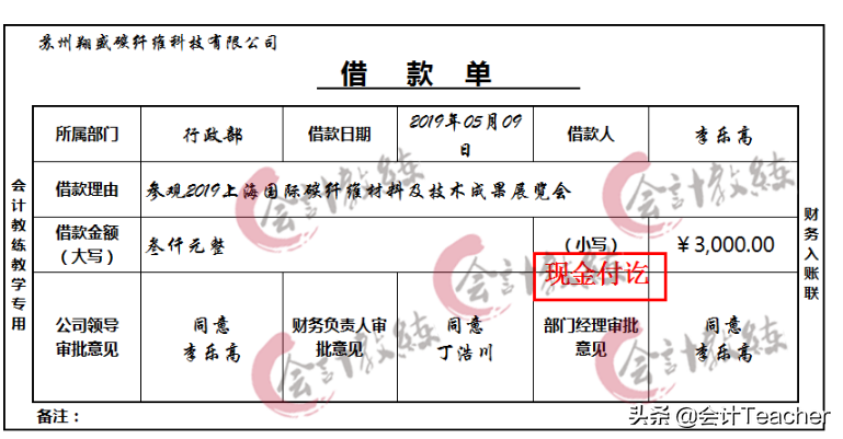 05月09日,总经理李乐高借支差旅费3000元,用于参观2019年上海国际纤维材料及技术成果展览会。出纳以现金支付。