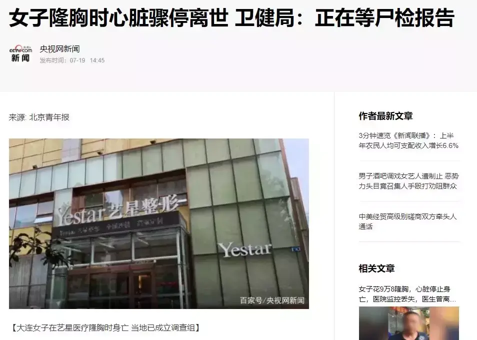 7月初,32岁女子王某在大连艺星医疗美容医院隆胸手术时发生意外,经抢救后不幸身亡。