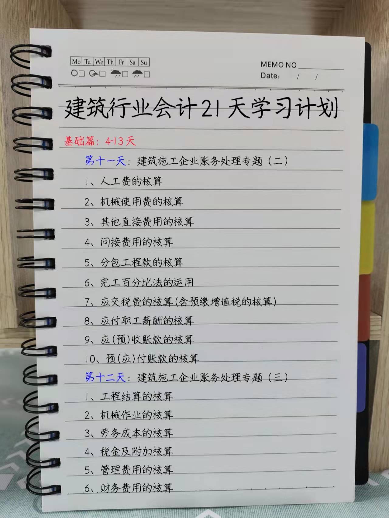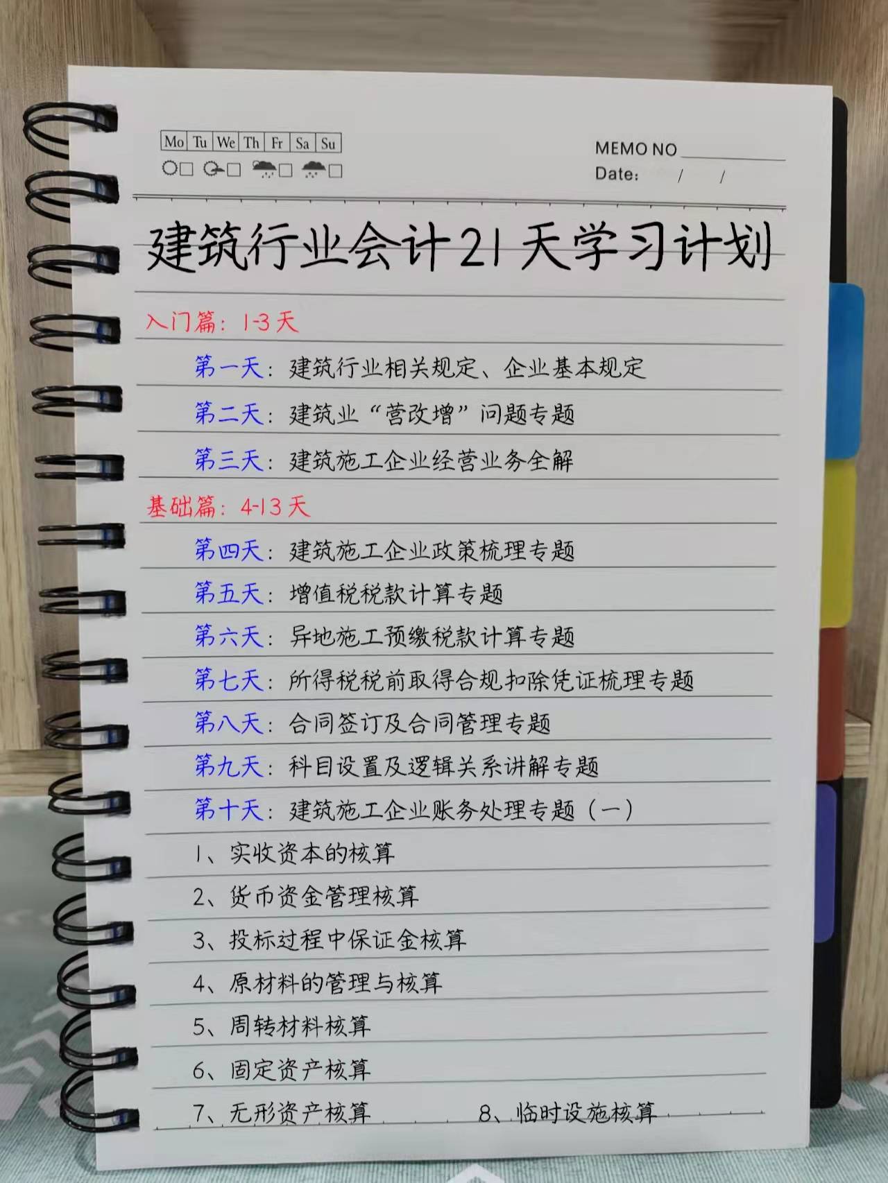 最近几年客服不太好做,工资不高不说,还经常上被老板指责,下被买家骂,太难了,脾气都变得爆炸了!听说会计行业不错,尤其是建筑行业的工资比较高,就找了个退休老师帮忙制定了一份21天学习计划,每天照着计划学习,老会计也帮忙总结了不少建筑会计的实操资料。