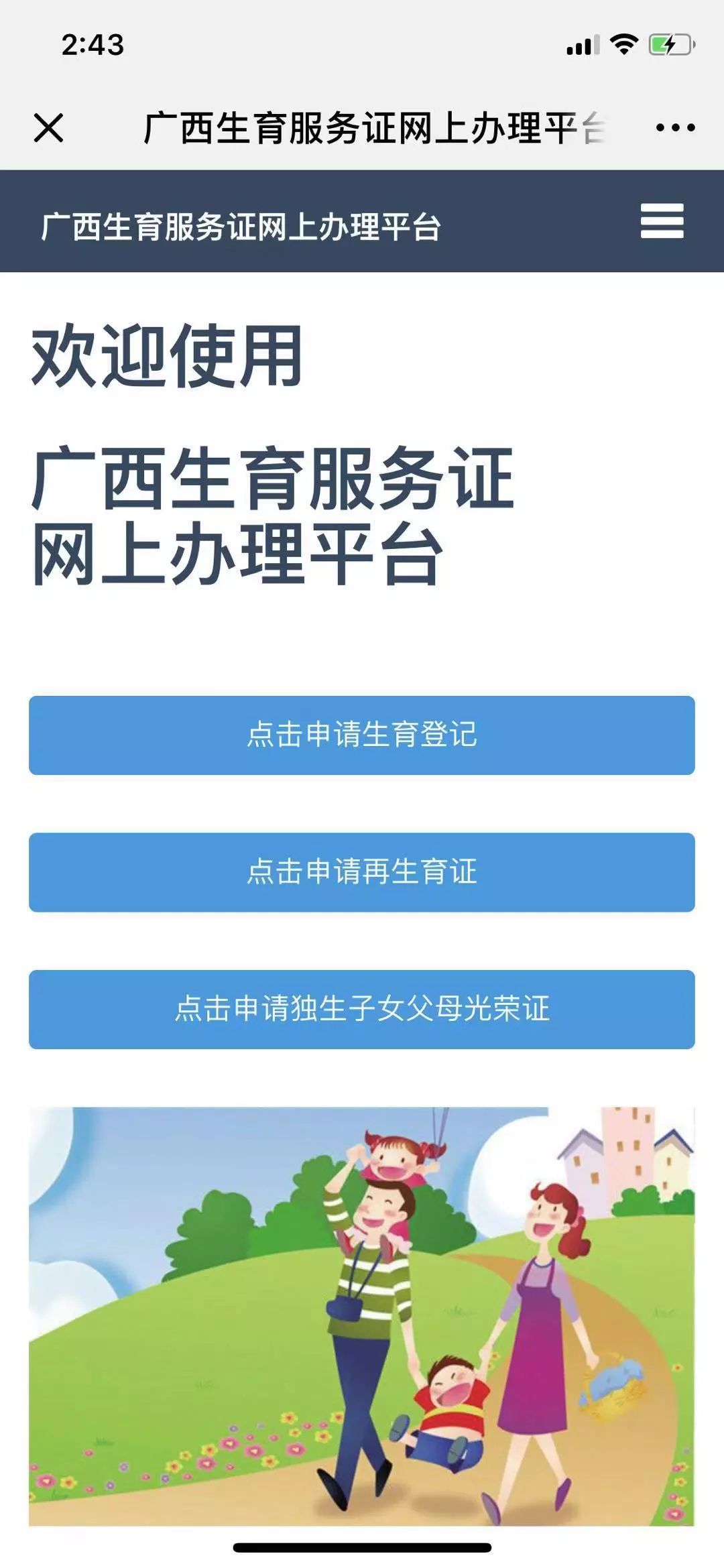 第三步:选择办理的业务。注册成功后点击办理的相关业务。平台提供生育登记(计划生育服务手册)、再生育申请(再生育证)、独生子女父母光荣证办理业务。
