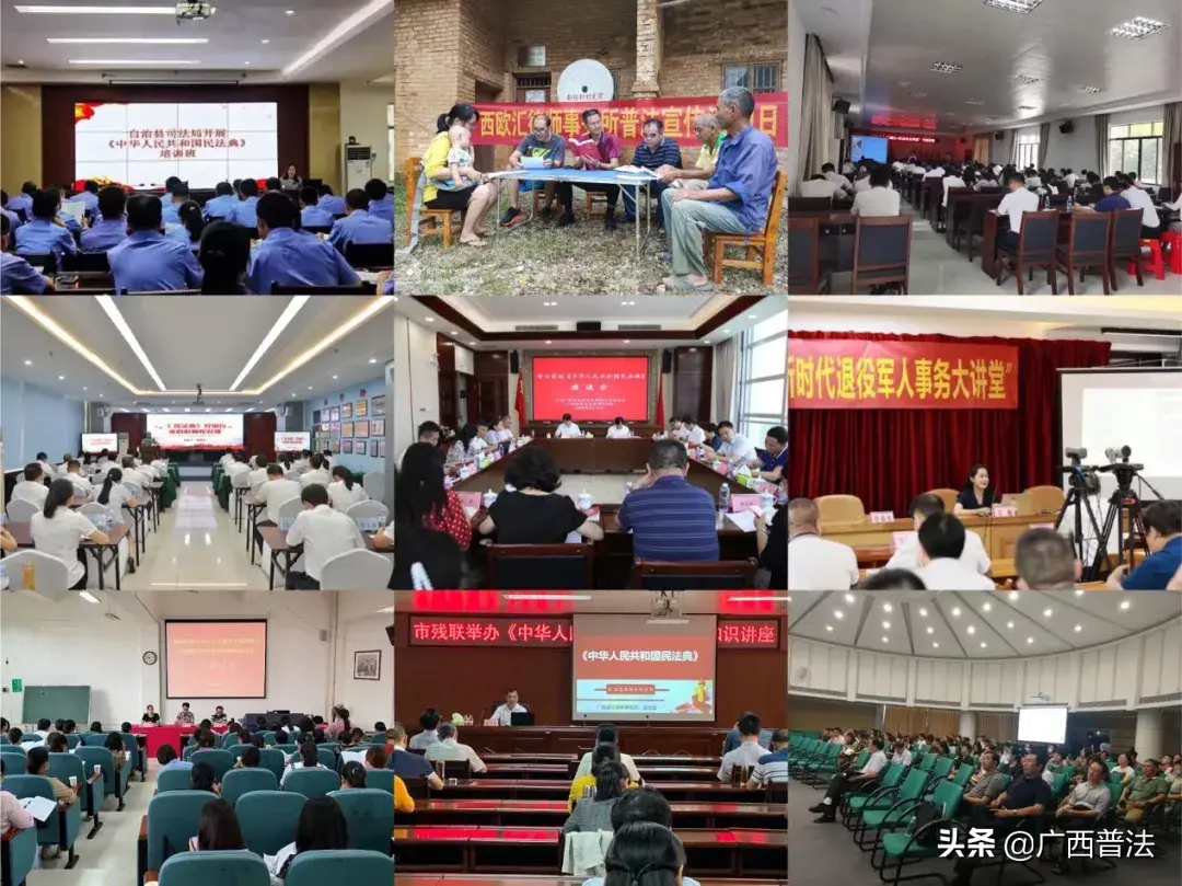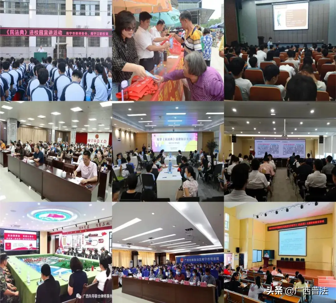 为推进全区各地深入开展民法典法治宣传教育,迅速掀起学习宣传民法典的热潮,自治区党委宣传部、自治区党委全面依法治区委员会办公室、自治区司法厅、广西法学会联合聘请全区法学、法律界著名专家学者39人组建“广西壮族自治区民法典宣讲团”。南宁、柳州、梧州、北海、贺州等各市律师协会陆续筹建宣讲团,广西广合、同望、华震、桂庭等律师事务所也自发组建宣讲团,逐渐形成司法行政系统—律师协会—律师事务所三级上下联动模式。广西律师行业民法典宣讲队伍充分发挥自身专业优势,义务开展《民法典》宣传,以进企业、进乡村、进机关、进社区、进校园、进军营等一系列活动为抓手,创新模式,分层分类,因材施教,推动民法典宣传教育深入人心。