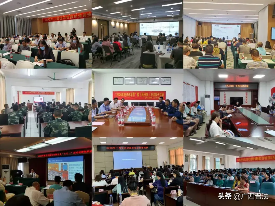 为更好地将《民法典》宣讲“飞入寻常百姓家”,广西律师在深入常年法律顾问单位及企业开展《民法典》宣讲的基础上,进一步拓宽普法的覆盖面,拓宽青少年、驻桂台商、社区工作人员、军人等宣讲对象,让各行各业学法用法带动全民普及《民法典》工作的深入推进。广西同望、国海、正泰和等多家律师事务所应邀为常年顾问单位广西融桂物流集团、广西金福农业有限公司、广西柳工集团有限公司等大型国有企业或者民营企业的员工宣讲《民法典》;广西华尚、先导联合、桂力等律师事务所送《民法典》进军营;广西南国雄鹰、益远、顺景等律师事务所送《民法典》进社区;广西钧亚、广正大等律师事务所应邀为广西外国语学院、柳州市特殊教育学校的多家学校的教职工开展民法典解读专题讲座;广西万益、北京大成(南宁)、中司、万凯等律师事务所为新阶层人士、总工会、驻桂台商、女商会等社会组织举办《民法典》热点、亮点法律讲座。