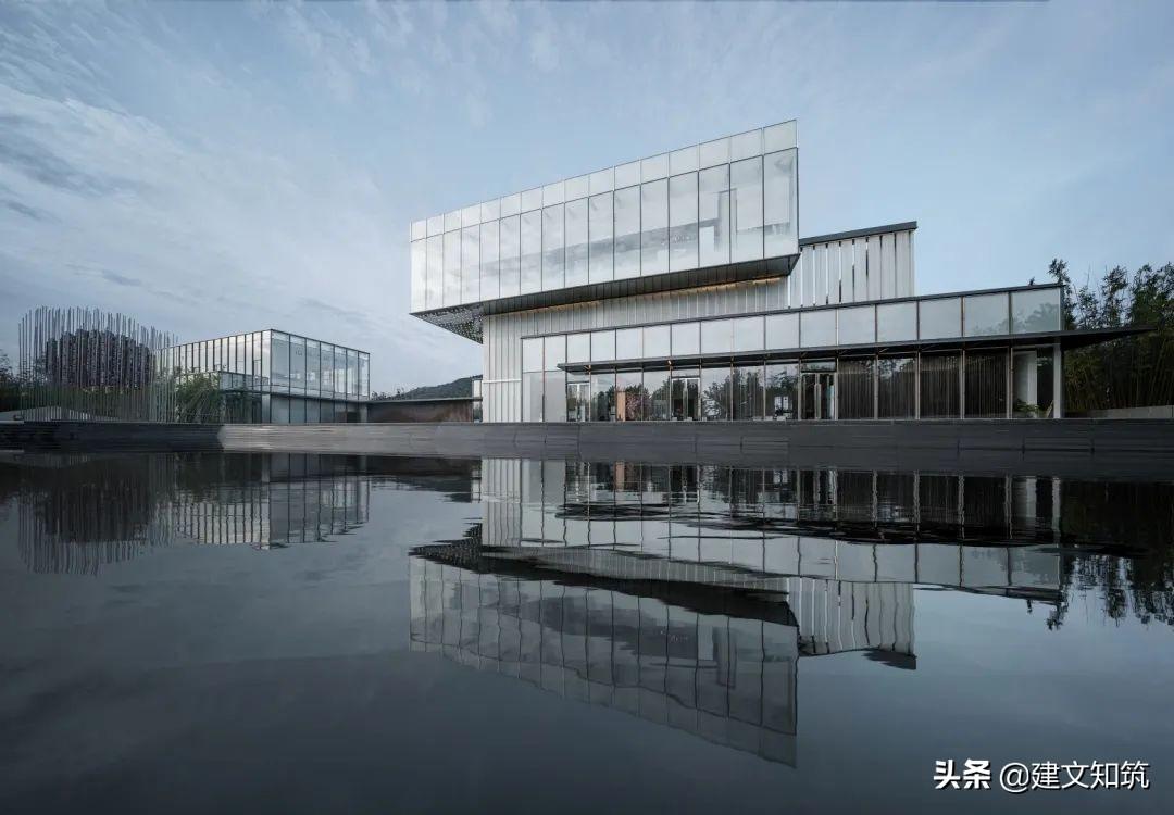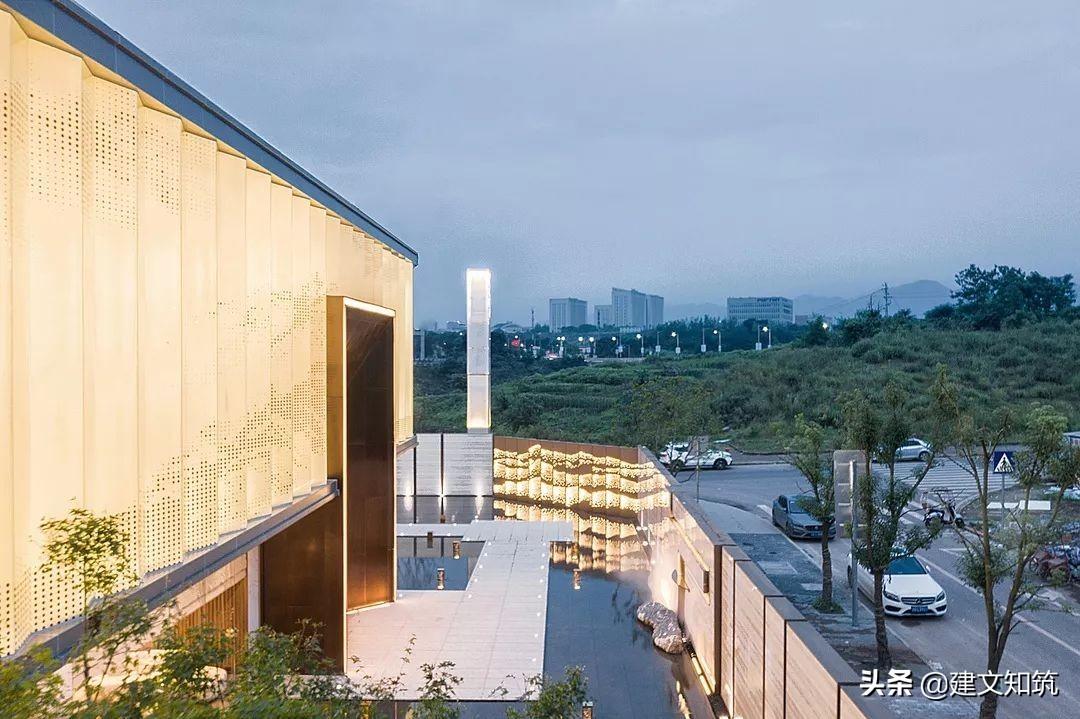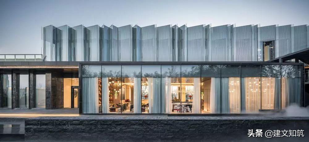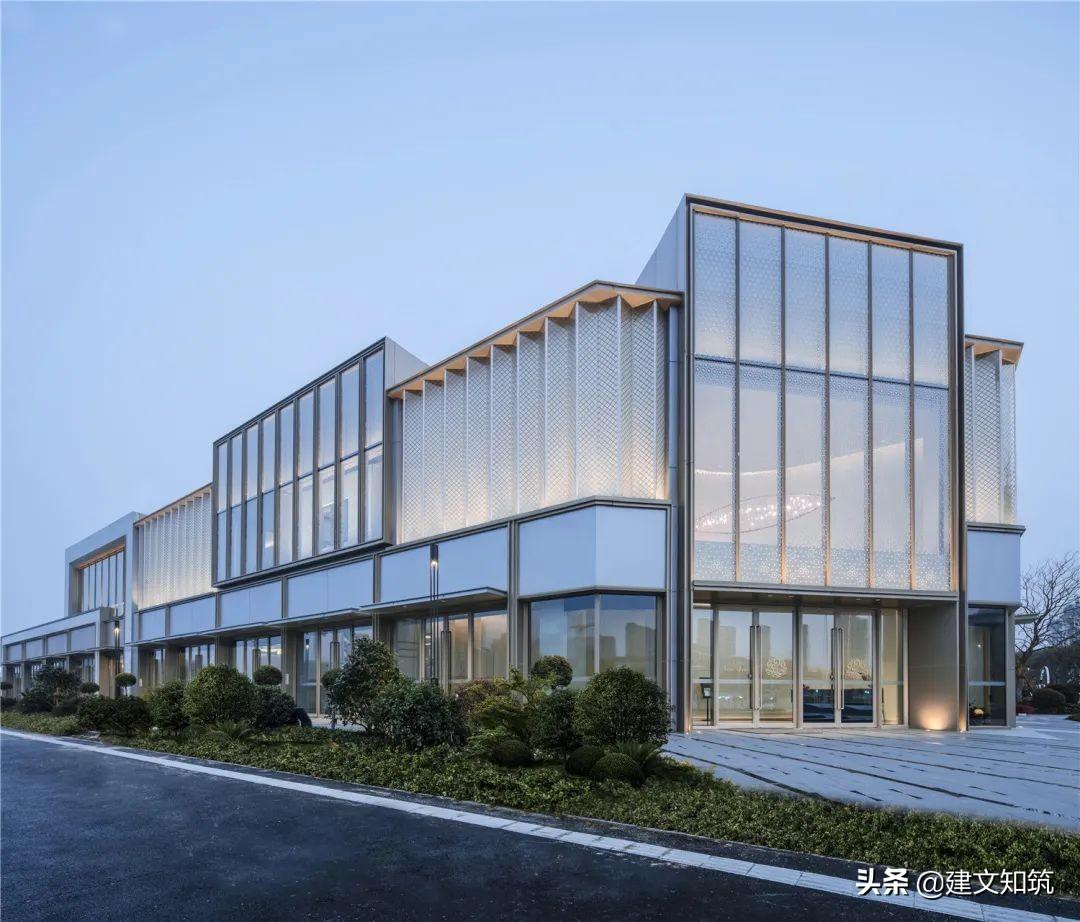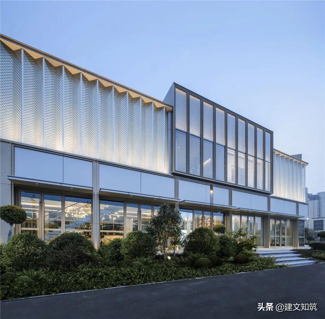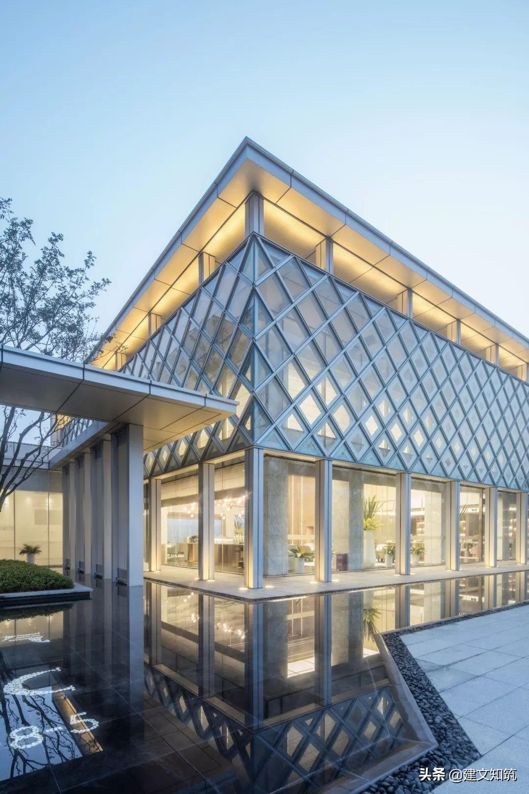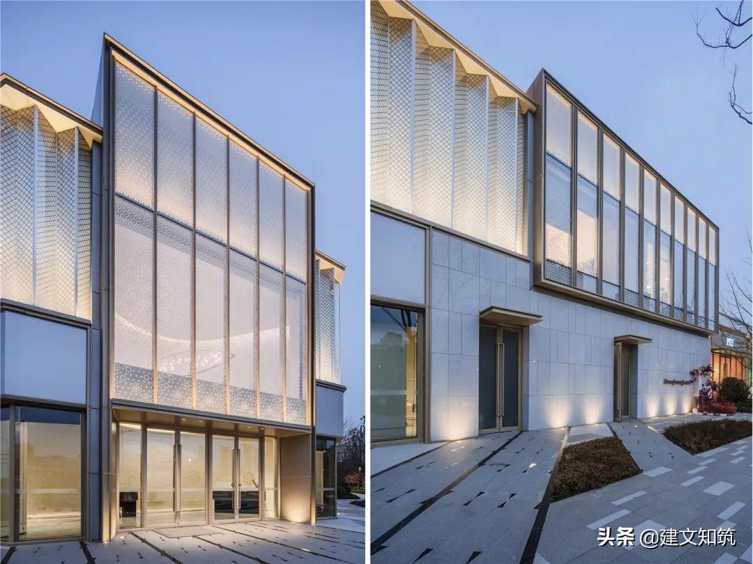 重庆江州锦云售楼部, 取扇之画,山水之形,抽象为圆点融合于折面中,用彩釉工艺将抽象的山水画与折玻璃幕墙相融合,成功以现代元素打造出古典美。