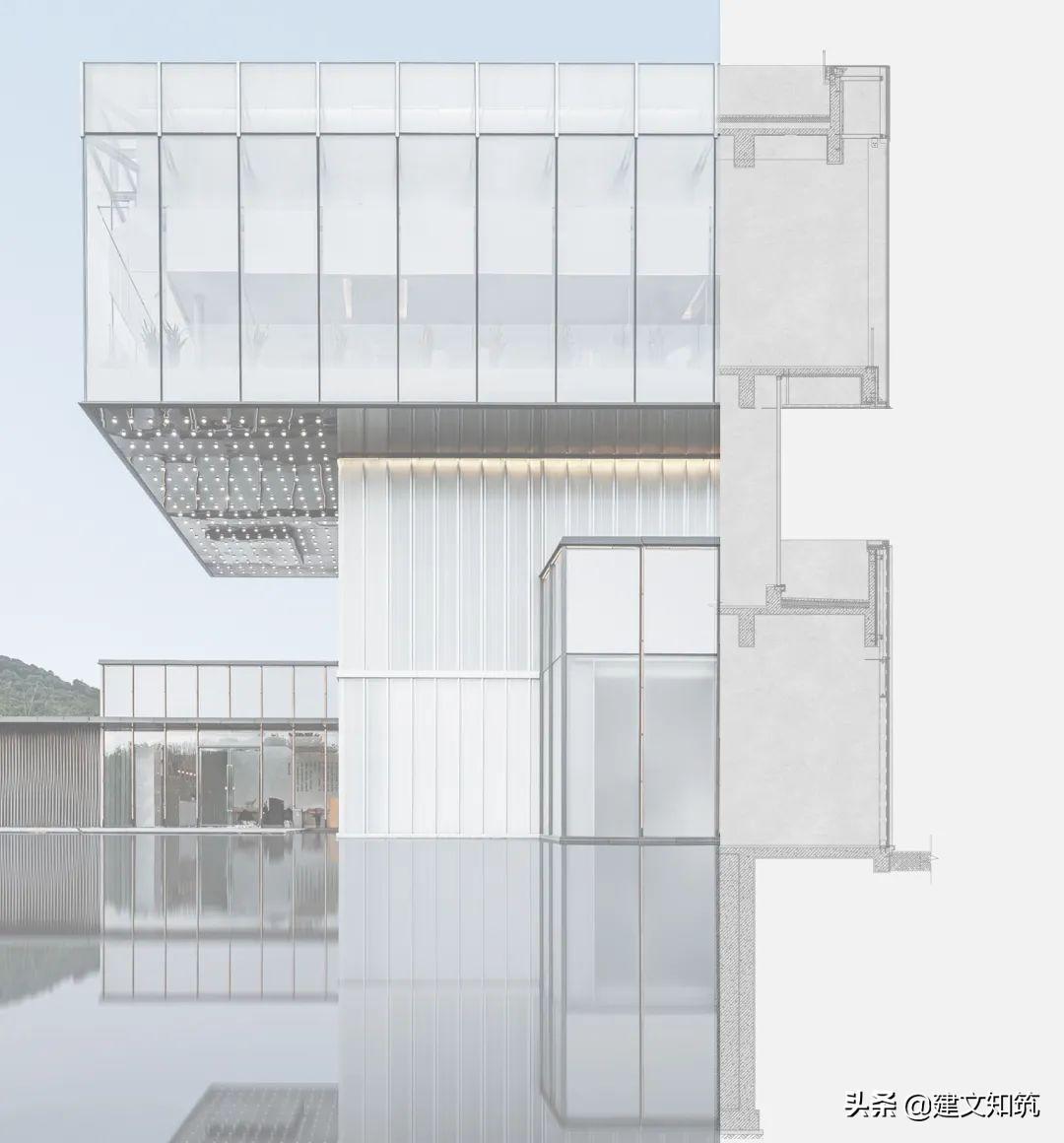 无锡融创·敔山桃源玻璃盒子的观湖界面形成悬挑空间,三个玻璃盒子采用不同材质,底层采用透明玻璃和银灰色铝板结合金属框,形成开放的入口迎客空间。二层喷砂超白u型玻璃和白色铝压条,与三层的透明玻璃结合镜面不锈钢横向檐板,上下错动,形成简洁通透又极具雕塑感的建筑形象。