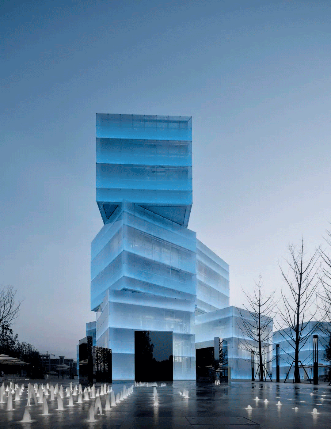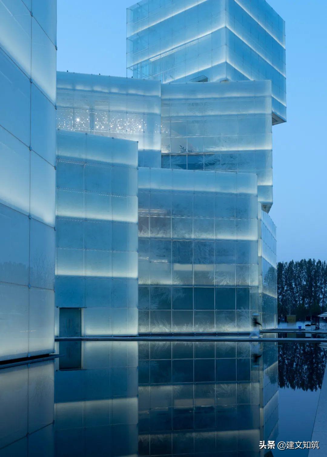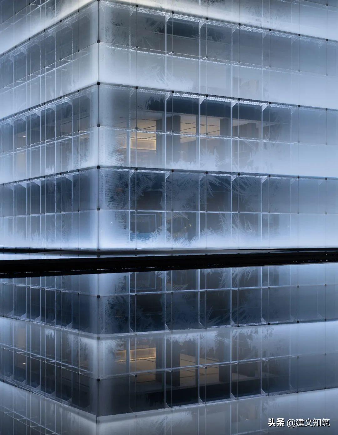 建筑外立面采用数码打印玻璃技术,日间,白色冰块相互叠加的建筑形式清冷高级,错落有致。在硕大的立方体之间,半透明的冰晶玻璃立面可以过滤光线和内部视野,时隐时现。