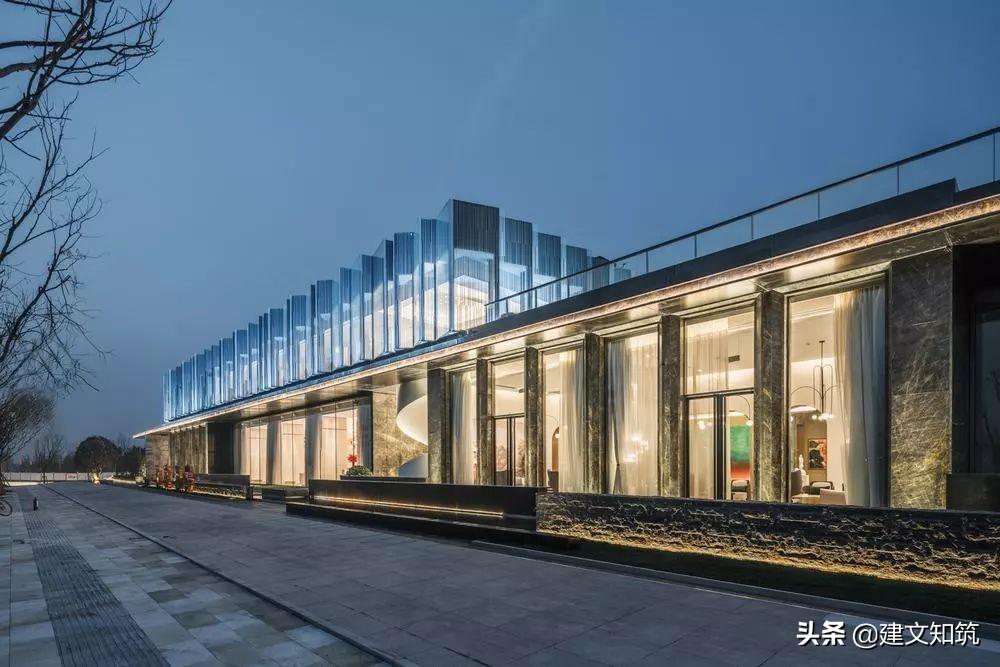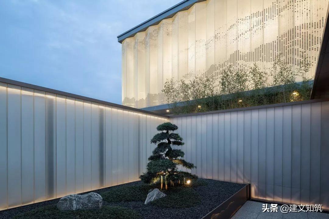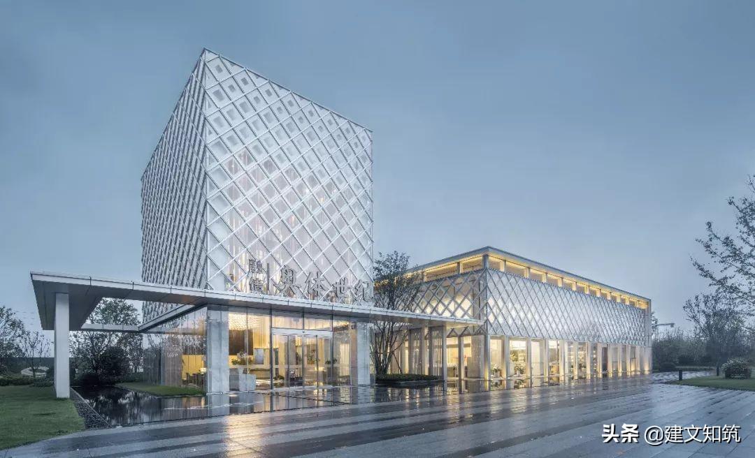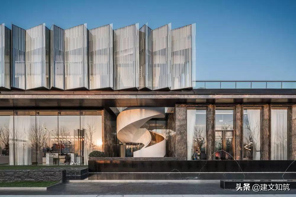 郑州融信奥体世纪售楼部,竖向与横向两个渐变白釉玻璃幕墙的有机组合,水平向铝板雨棚所起的作用,则是增强他们之间联系的同时,围合出一个近似于“U形”的庭院空间,竖向铝制格栅其实在,加强这种“围合感”和造就“光影感”。
