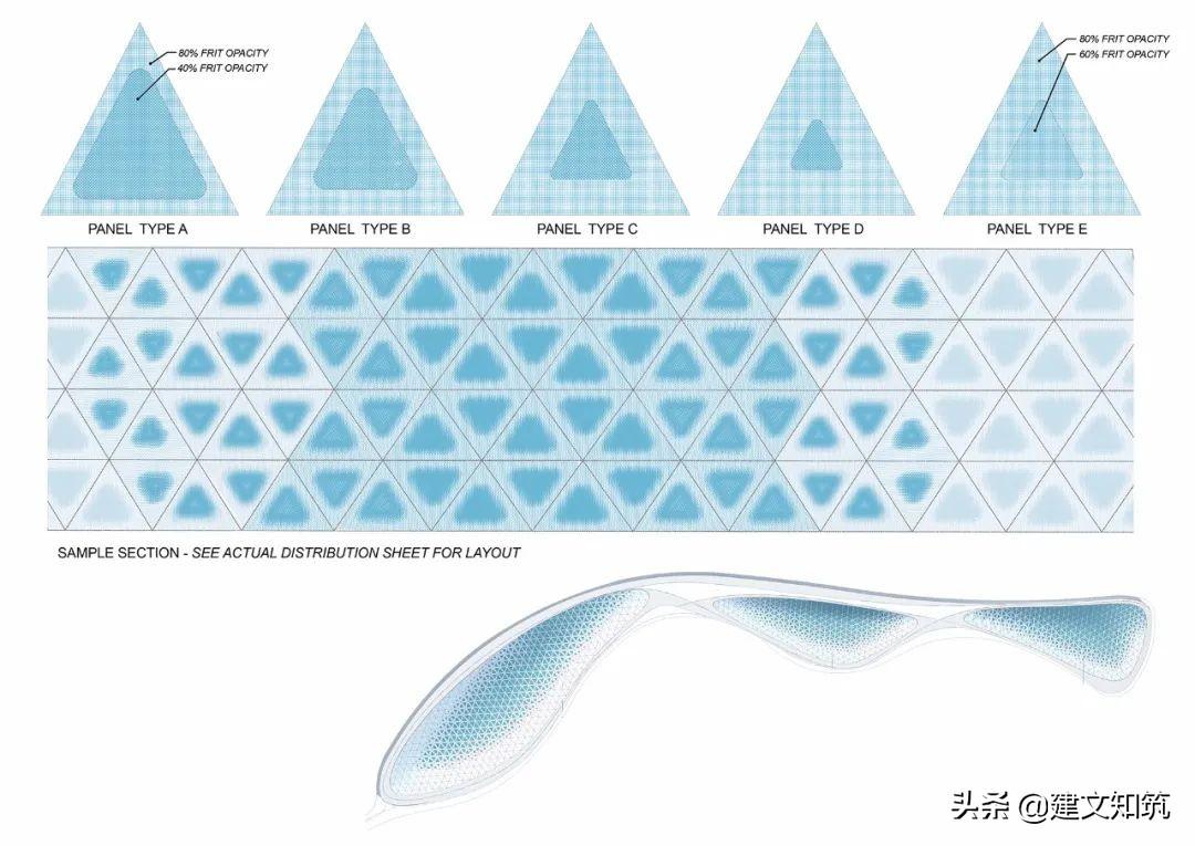 彩釉玻璃渐变纹理控制:结合立面幕墙和视线分析,反复推敲立面彩釉渐变肌理的选型,确保更佳建成效果。