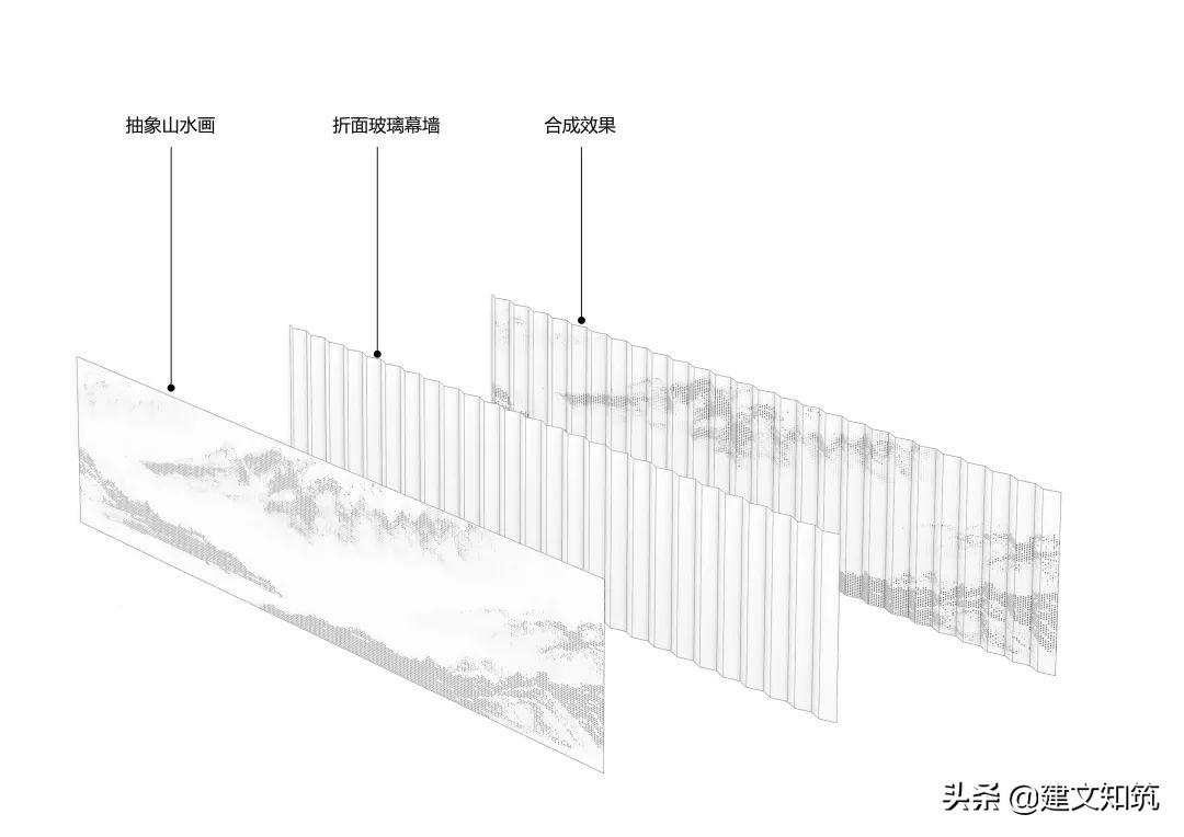 折面玻璃幕墙在灯光的烘托下,晶莹透亮、极富现代色彩,抽象山水画将其艺术文化融入其中,跨过时间的界限,文化与现代艺术结合。