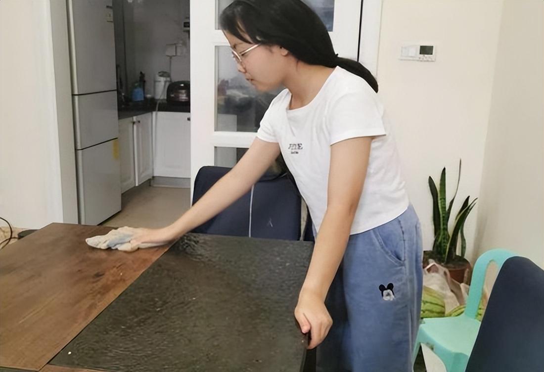 “嘿,餐厅打扫得不错啊。桌子擦得很干净喔!别忘了把抹布洗干净喔。“
