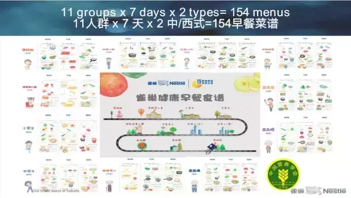 雀巢做过一次实验,发现每个人对早餐的需求都不相同,我们设立了11组人群,为了这11组人定制了不同的营养早餐,同时联合中国营养学会合力打造了154种早餐菜谱,