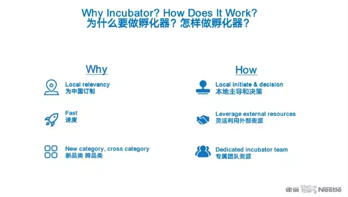 为什么有孵化器组织,最主要的原因是过去雀巢的创新速度太慢,除了要在内部现有的组织推行创新外,最恰当的方式是成立一个独立组织,做创新楷模。