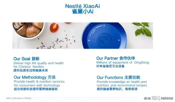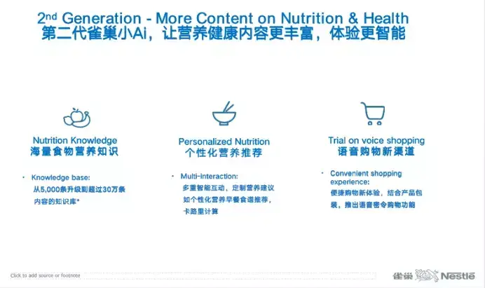 2018年雀巢小Ai又做升级,资料的数量从5000条变成了30万条,除了有很多个性化的营养推荐外,雀巢小Ai还跟购物做了连接,消费者可以通过语音来购买雀巢产品。