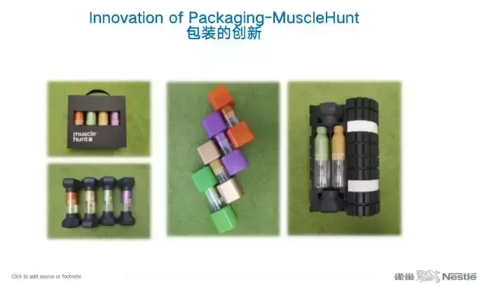 第二个品牌是肌猎,高蛋白质水。随着健身人群越来越多,健身人群最主要的补品是蛋白粉,但是蛋白粉冲泡繁琐,不易溶解,口味粘腻,这些是蛋白粉产品的痛点。为此,雀巢推出了高蛋白质水,随时补充蛋白质,解决使用蛋白粉的痛点。