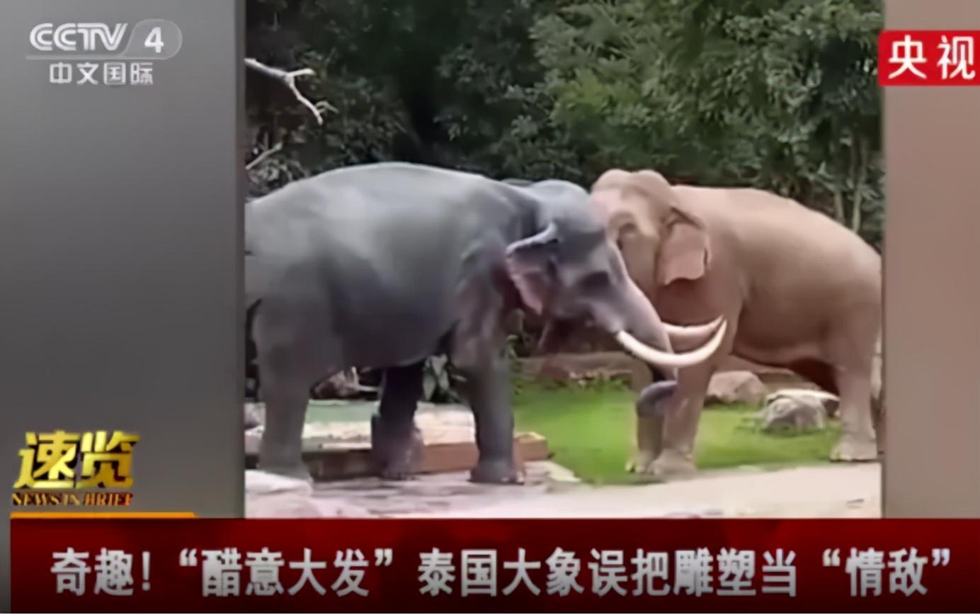 2、醋意大发!大象把雕塑当情敌撞倒 近日,泰国考艾国家公园,一头雄性大象误以为入口处的一个岩石雕塑象是“情敌”,愤怒地进行了攻击,将其撞翻在地。公园管理员表示,雄性大象经常为雌性而争吵,它看到雕塑误以为真,需要展示自己的支配地位。(@央视网快看)