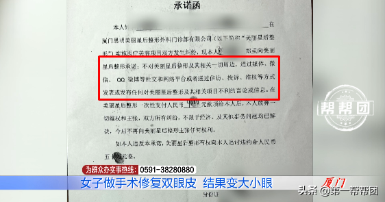 双方在思明区卫生和计划生育监督所厦禾派驻点内签署的这份承诺函上写到,郭女士向美丽星后整形承诺:不对美丽星后整形及其相关一切周边,通过媒体等社交和网络平台等方式发表任何对机构不利的言论,如违反本承诺,整形机构有权向郭女士追讨违约金50万元。