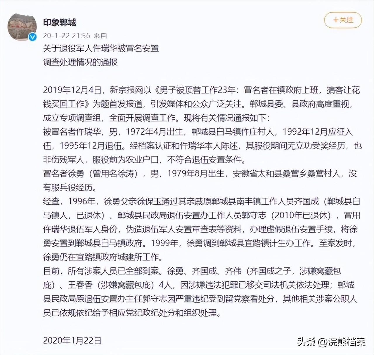 经过法院的最终审理,认定徐勇等人通过暗箱操作,冒用仵瑞华的身份信息,享受退役军人优待,侵犯了仵瑞华的姓名权等权利。