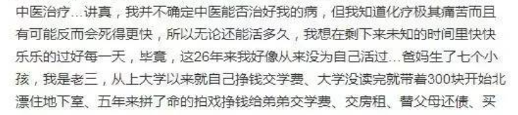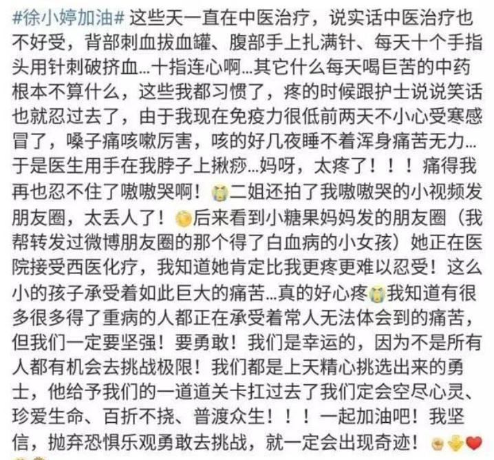 看到这儿是不是觉得很感动?徐婷也被感动了,所以,她最终还是没能完成自己的愿望,选择了留下来治疗。而恰恰是这个选择,导致她的身体机能加速衰退。