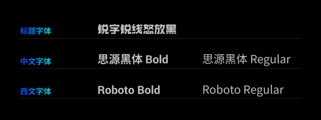 然后,是字体的选择。标题字是客户购买的版权字体 —— 锐字锐线怒放黑。而正文选用的是思源黑体和 Roboto。