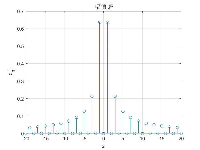 clear,clc T = 2*pi; % 周期 omiga = 2*pi/T; sw = @(n,t) exp(-1i*n*omiga*t).*square(t); N=20; Cn = zeros(1,2*N+1); % 计算Cn for n=-N:N Cn(n+N+1) = quad(@(t)sw(n,t),-T/2,T/2,1e-9)/T; end n = 0; c0 = quad(@(t)sw(n,t),-T/2,T/2,1e-9)/T; % 计算C0 stem((-N:N).*omiga,abs(Cn)); grid on title('幅值谱');xlabel('\omega');ylabel('|c_n|');2 傅里叶积分与傅里叶变换