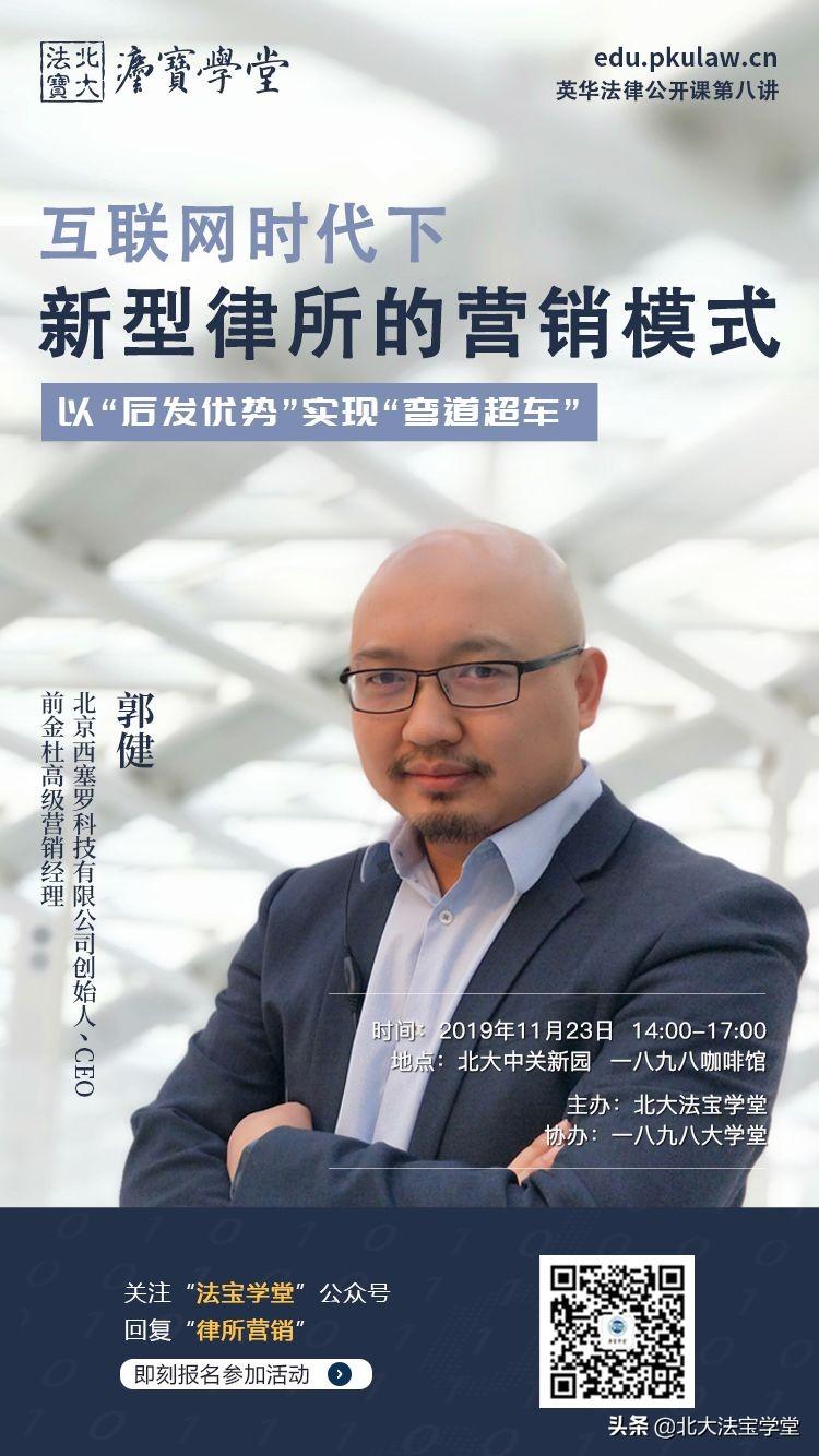 由北大法宝学堂主办的“英华法律公开课第八讲”将在本周六正式开讲。我们邀请了前金杜高级营销经理,西塞罗科技创始合伙人、CEO郭健先生就新律所的营销模式进行分享,并探讨如何通过管理、营销、平台为律所赋能。