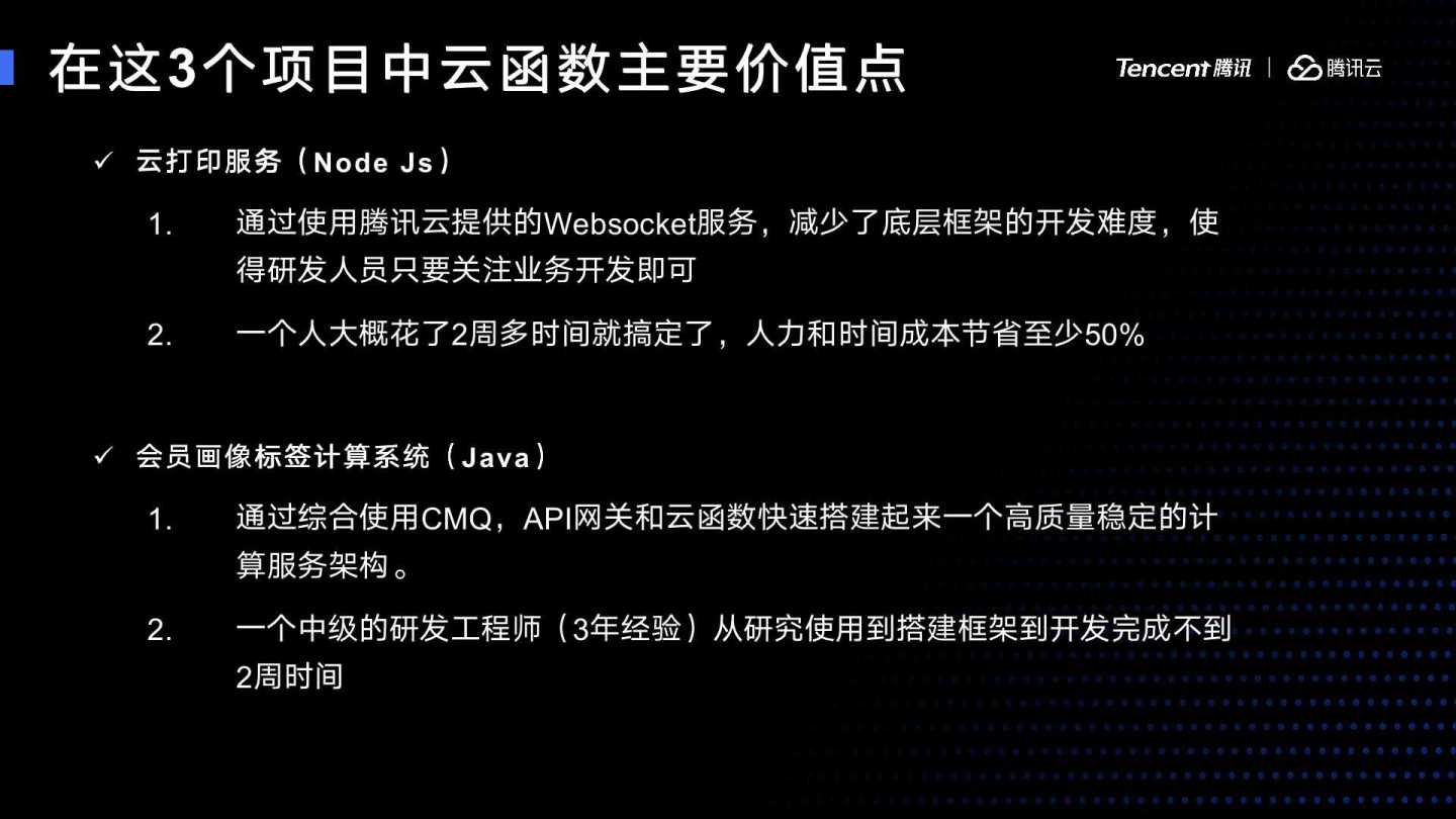 最后,运维成本。因为云函数有一个很强的特征,不运行则不产生费用。第二个不产生资源的占比,没有多大服务器的成本。另外扩容也是全自动的。它的运维成本很低。