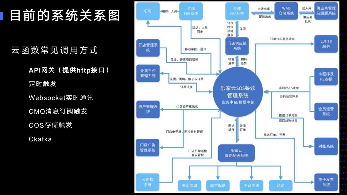 早期,我们用云函数来做多个业务系统之间的对接,尤其是解决多个异构系统之间的数据连通,因为我们整个系统的重构不是一天就能完成的,是慢慢去做的,慢慢不断的反复,不断的去调整这些功能。一步一步慢慢去做,多个异构系统的黏合剂。