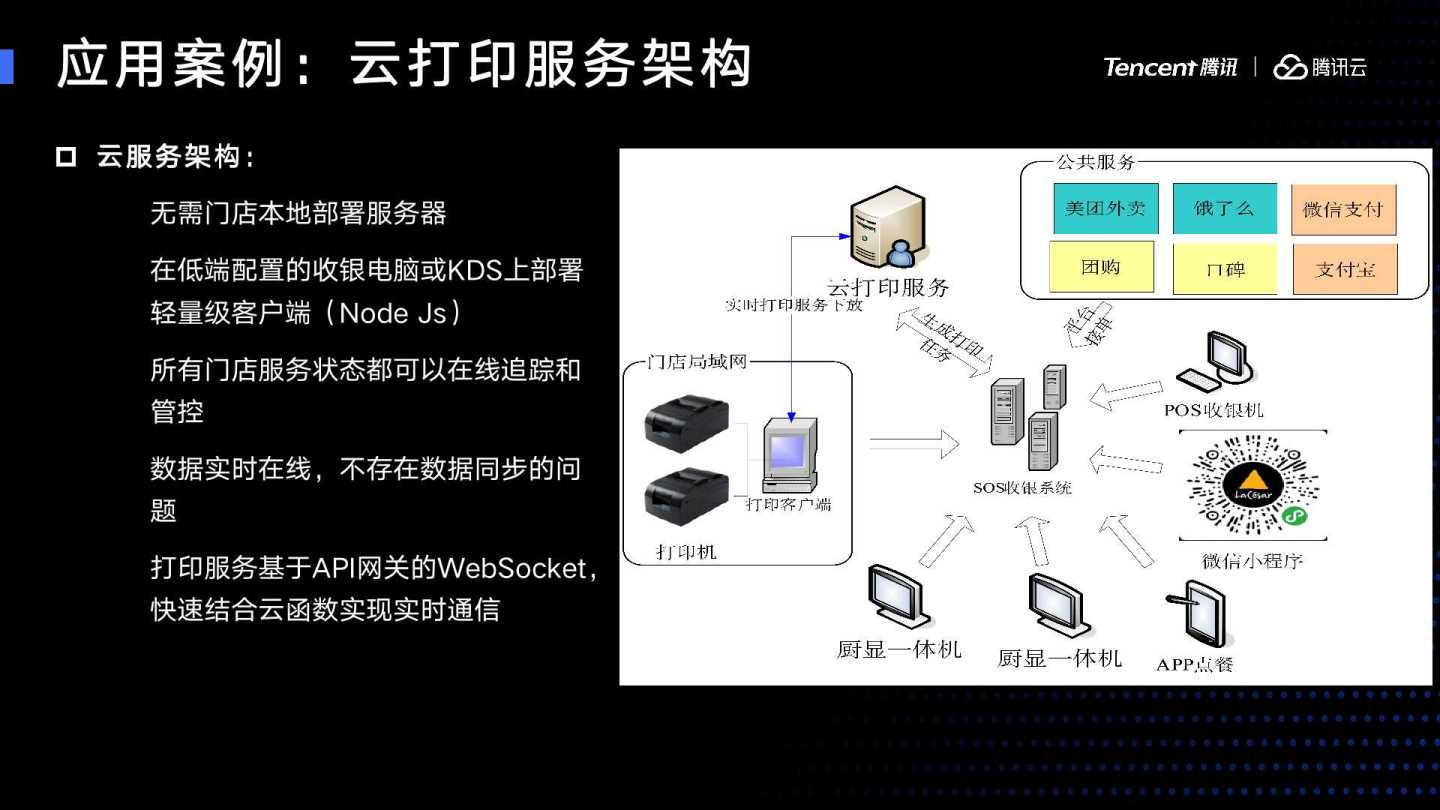 打开浏览器,就可以实时传回所有订单数据,可以追踪你所有的服务状态。打印机它是在门店的局域网内部,所以我们单独在我们云端的服务,就是我们SOS收银系统,还有云打印服务仍然实现云打印服务,通过它连接我们本地的收银机客户端,由它来定制我们的打印机,它是实时通讯的,随时知道门店的打印机是否能正常打印,是不是卡纸,是不是纸打完了,没有纸了,我们随时都可以知道。这个过程就解决了门店很多问题,由于订单是可追踪的,打印机会随时把故障解决。
