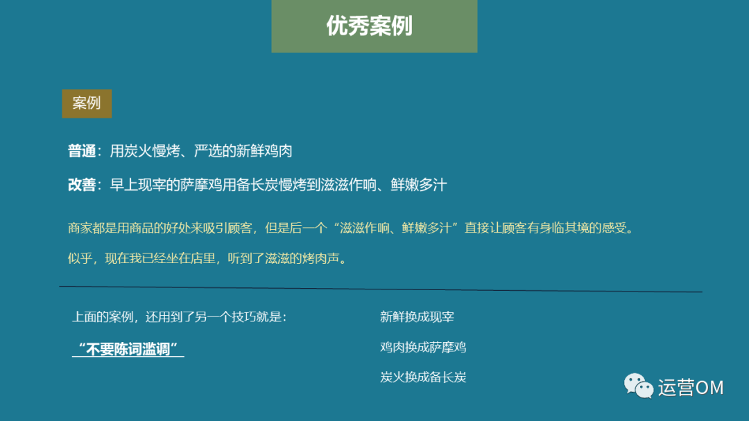 第一个文案可以打一个及格分60分,但是用新词替换后,让这个商家立马跟同类竞争者区分开来。文案真的是销售的利器。