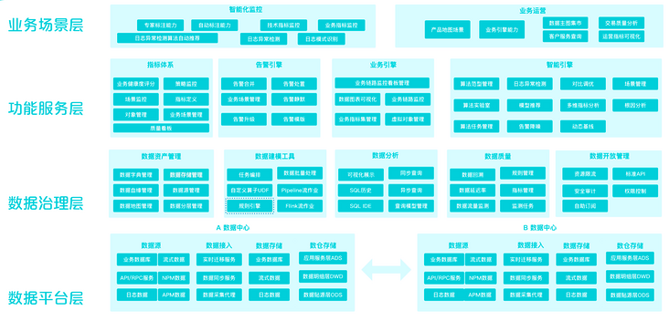 阶段一:能力 平台化 , 制定该阶段目标时更多地关注如何将产品能力打散进行功能化重组,从而打造满足金融行业运营运维综合需求的平台功能及系统能力。同时在建设过程中全面梳理企业运营运维场景数据模型,通过本平台承载并沉淀金融行业属性的方方面面,包括数据治理方法论体系等。阶段二:平台场景化, 阶段一基于平台能力建设的业务场景能力已初步具备可复用性,该阶段的目标将着重延伸至核心业务场景建设,并继续摸索如何提升业务场景能力的复用效率,为后续持续深化场景建设奠定好基础。阶段三:深化场景建设, 该阶段主要包含异地多中心部署架构升级及综合运营能力提升,保障已经在各核心业务场景建设完成的运营运维成果。该案例的整体功能框架自下而上可分为数据平台层、数据治理层、功能服务能、业务场景层五个层级,各层级功能如下: