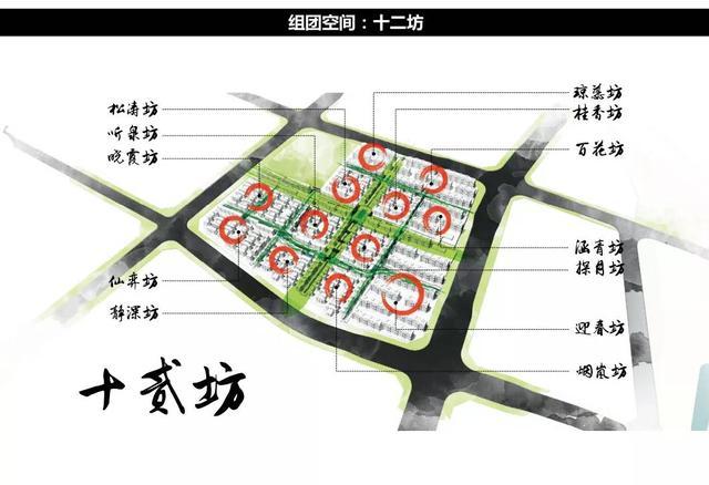 十二坊——松涛坊、听泉坊、晓霞坊、仙弈坊、静深坊、琼蕊坊、桂香坊、百花坊、涵青坊、探月坊、迎春坊、烟岚坊。