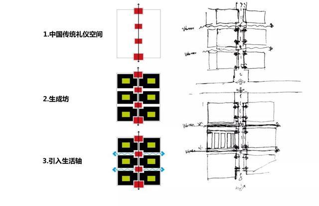 1.中国传统礼仪空间;2.生成坊;3.引入生活轴。