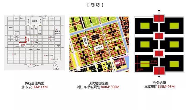 划坊——划分坊里,本案组团115M*95M。(三个层级)