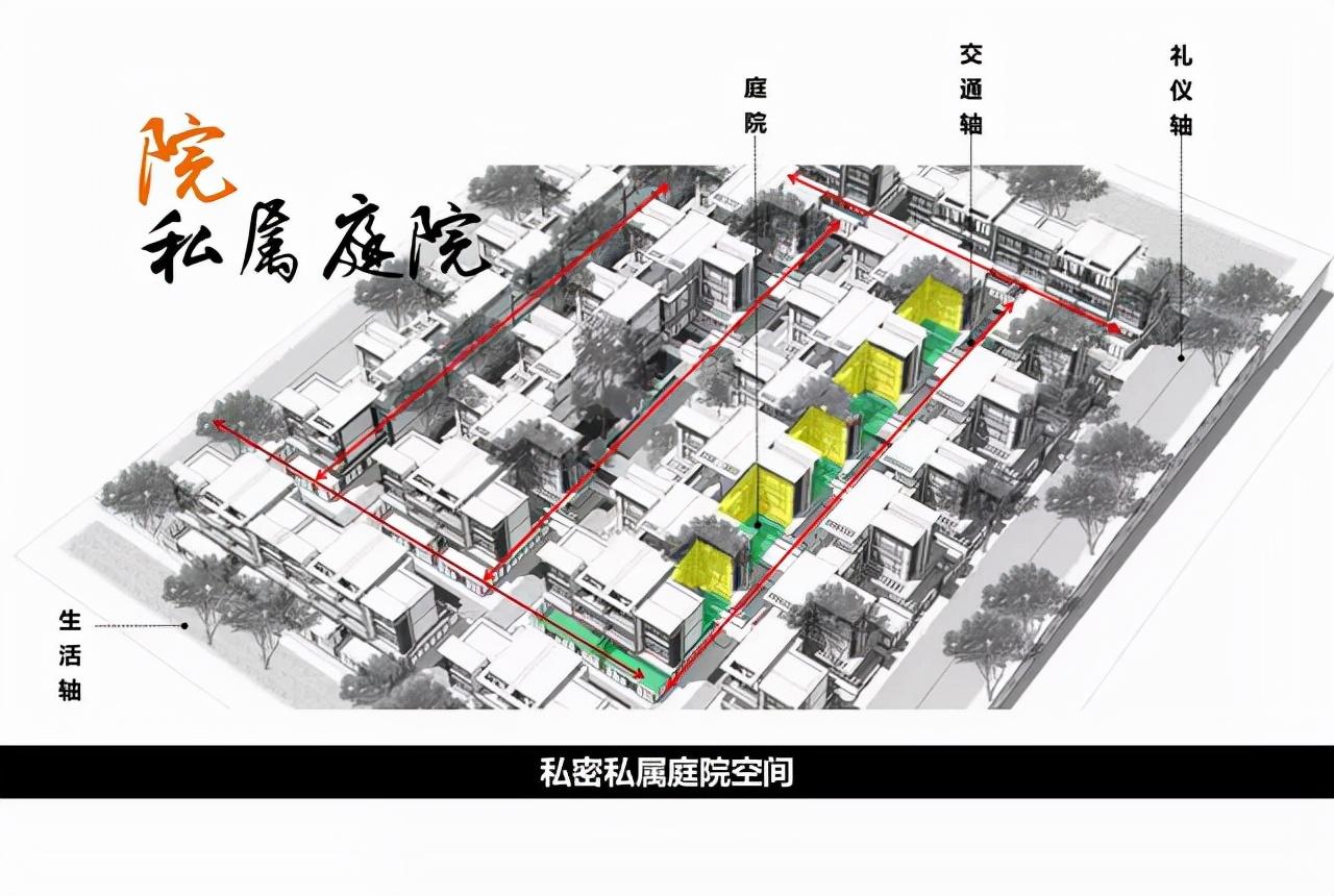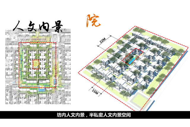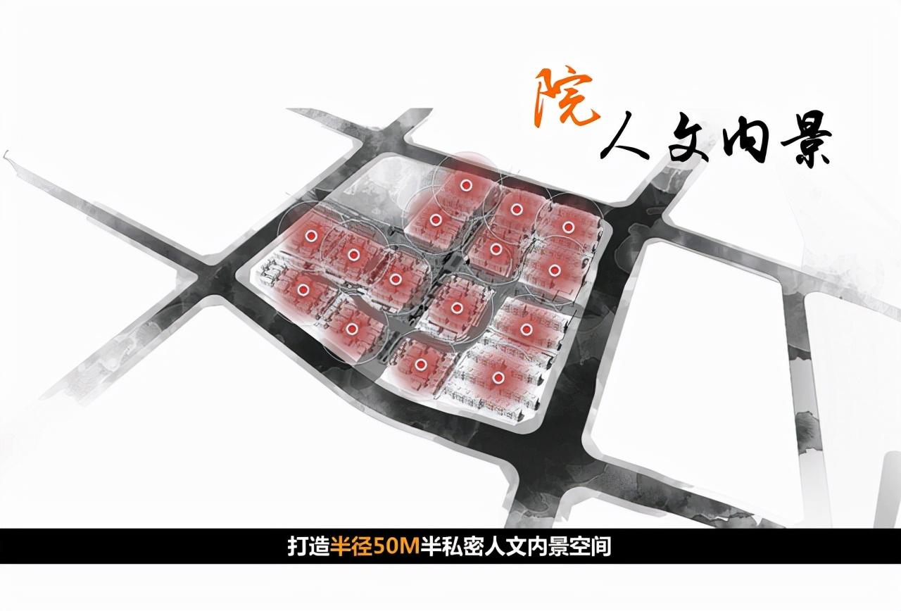 打造半径50m半私密人文内景空间;坊内人文空间;私密私属庭院空间。